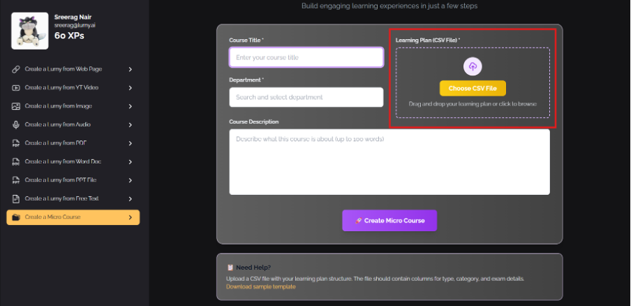 To set up a microcourse, fill in the details of the course, specify the relevant department, and provide a small description about the subject.