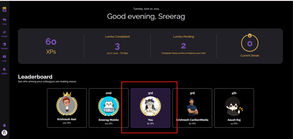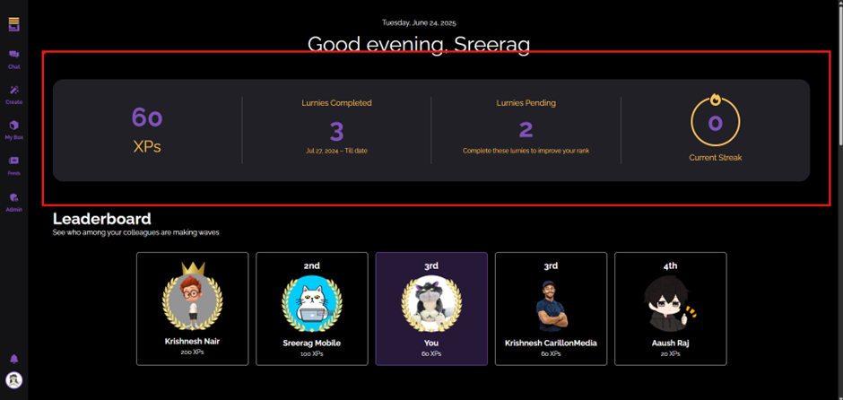 Get a quick snapshot of your learning activity within the application. Track the XP points you’ve earned, the Lurnies you’ve completed, and the ones still pending. You can also view your current streak, which highlights the number of continuous days you’ve stayed engaged on the platform. This overview helps you stay motivated and consistent in your learning journey.